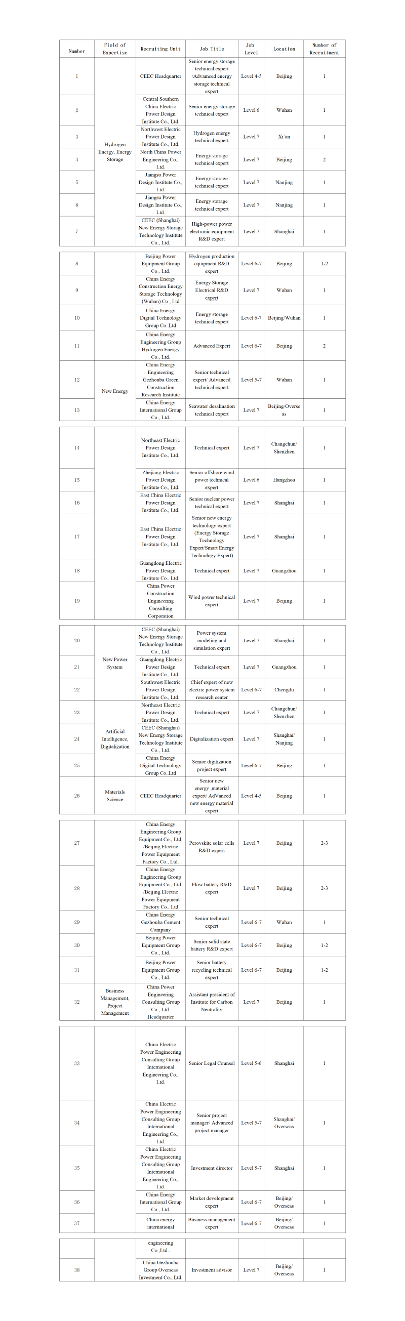 37 | 中國能源建設集團國際工程有限公司 | 商務(wù)管理專(zhuān)家 | 6級-7級 | 北京/ | 1人 | |